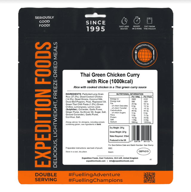 The Expedition Foods Freeze Dried Meal Pouch - Thai Green Chicken Curry With Rice - Various Sizes is ideal for those camping trips or hiking expeditions where you are looking to travel light. Not only will it provide you with a delicious and nutritious meal in just 5 minutes, but these pouches are super lightweight so will not weigh you down compared to heavy, wet rations. Offered in three different sizes, a regular serving, high energy serving or double serving these freeze dried meal pouches are ideal for any outdoor expedition and are sure to fill you up after a long day of adventures. With a shelf life of over 4 years, why not add a few pouches to your bug out bag or long term survival supplies!