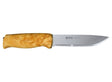 Crafted from superior materials, the Jegermester showcases a meticulously shaped handle crafted from hand-sanded curly birch, ensuring a comfortable and secure grip ideal for medium to large hands. The blade, expertly fashioned from 12C27 stainless steel, features a scandi grind and spans 135mm (5.32 inches) in length with a thickness of 2.8mm (0.110 inches). Its razor-sharp edge guarantees immediate readiness for any cutting endeavour.