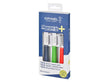 - Features a blue paring knife, a green serrated knife, and a red peeler