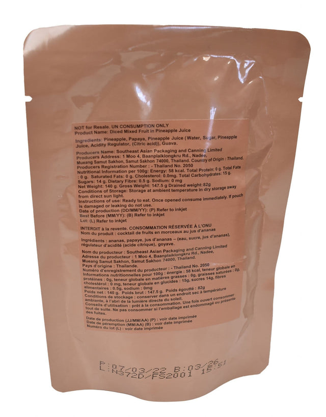 These are genuine British army ration pack diced mixed fruit in Pineapple juice. MRE's are a great long lasting food idea for bulk storage of your food preps or simply as a good nutritious snack when out and about. These are a great as a standalone snack or as a desert with other main meal pouches. These are 140g pouches