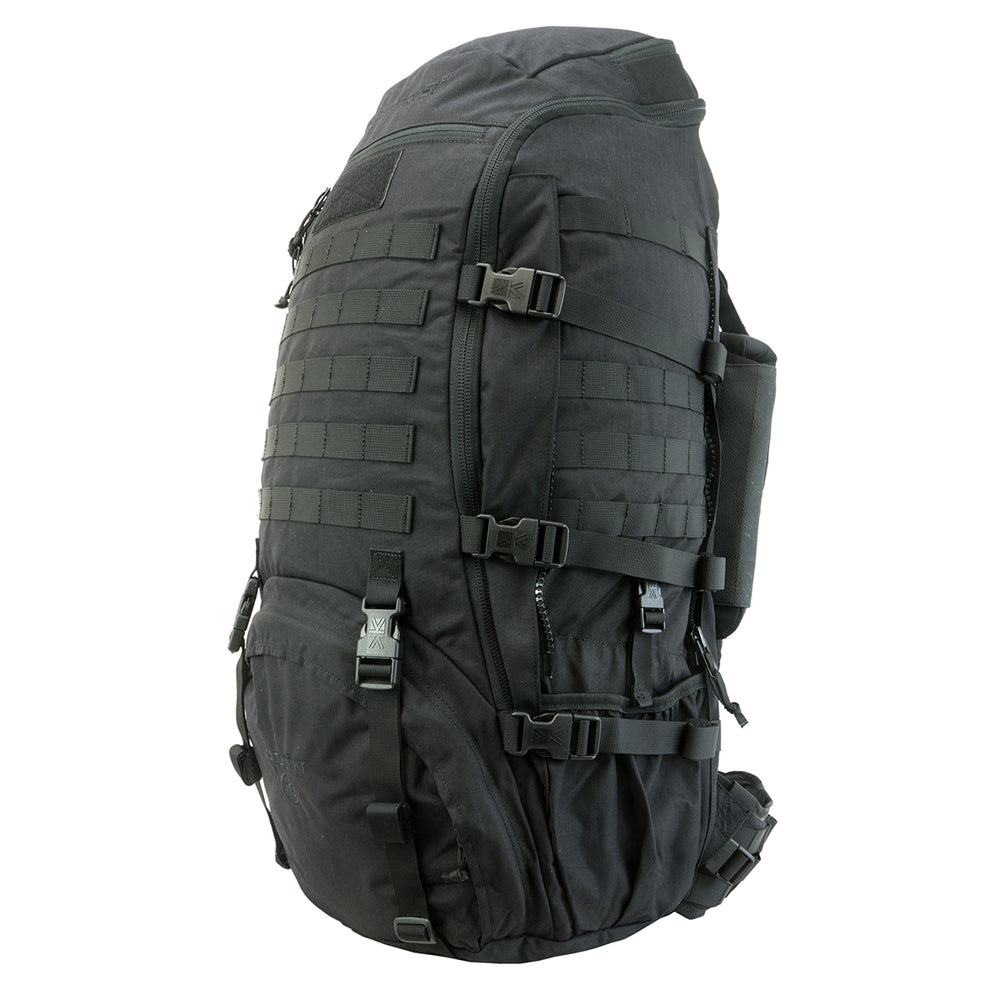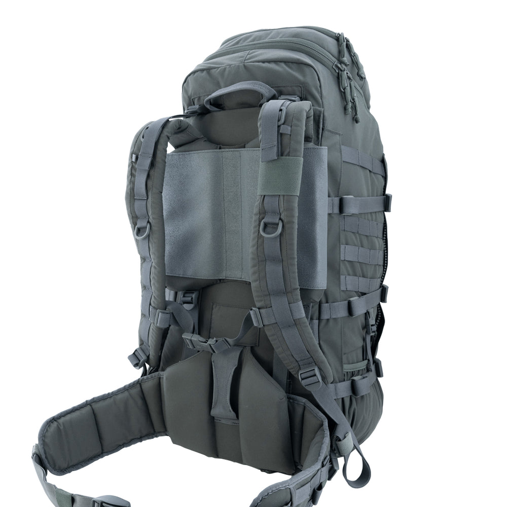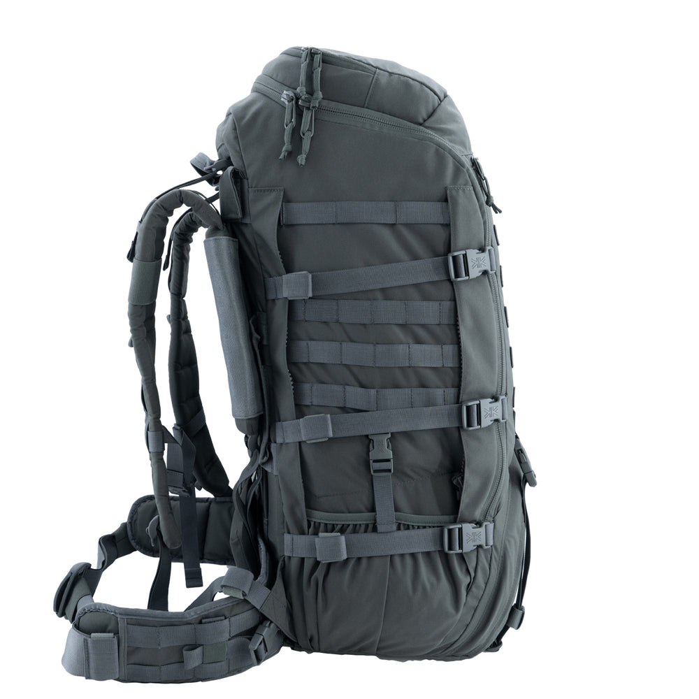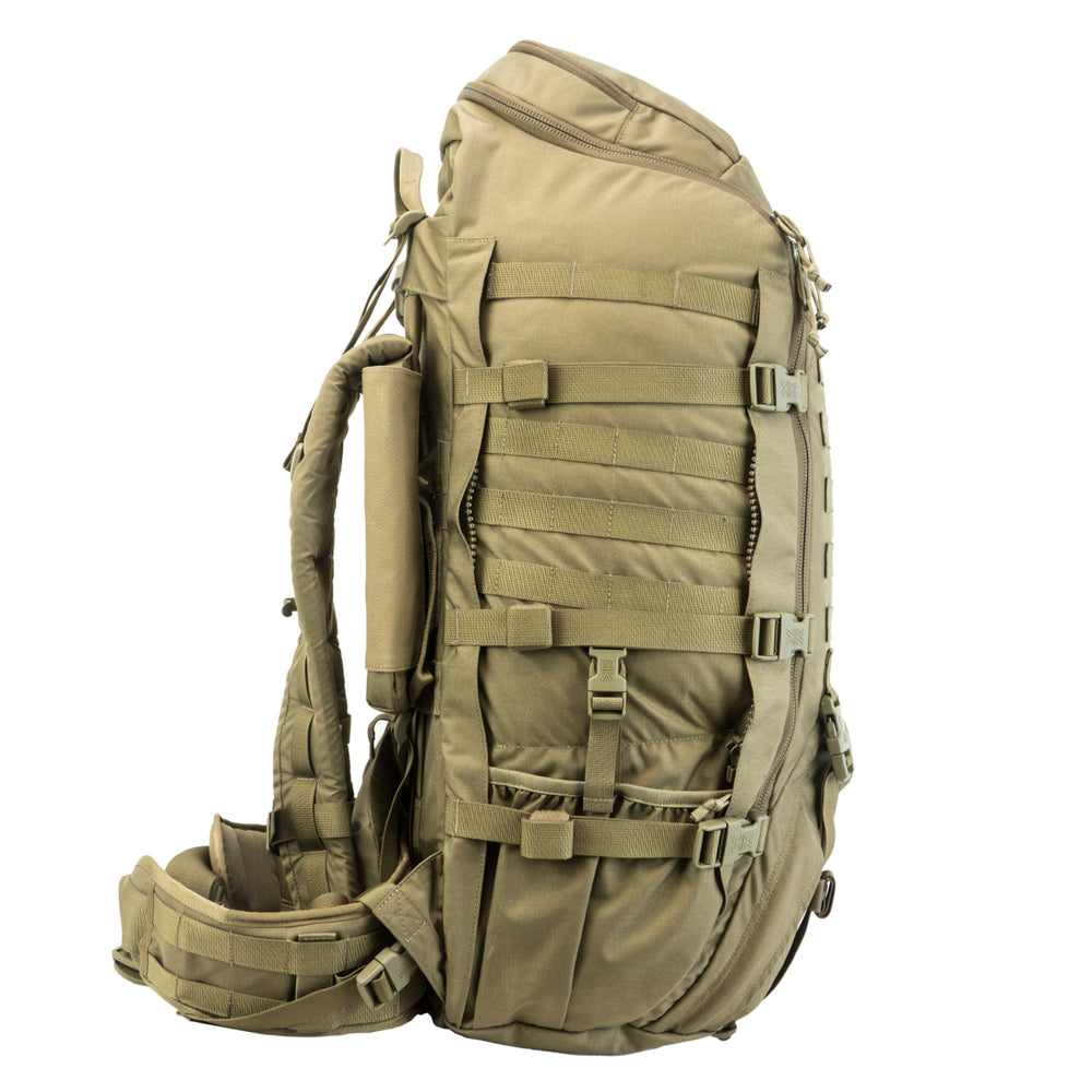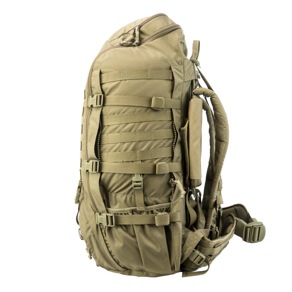 The ODIN 75 Litre mission pack offers a contemporary design featuring a spacious main compartment and additional storage options on the lid, sides, and front. With a pocket suitable for an A4 folder located at the front or back of the bag, it provides versatile storage solutions. The pack is equipped with side PLCE zips and a MOLLE system, allowing for the attachment of additional pouches. Webbing on the sides, front, and internal sections further enhances its adaptability.
