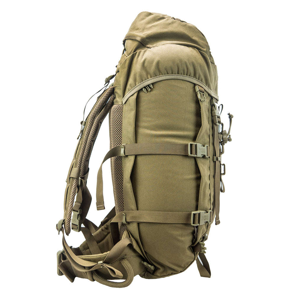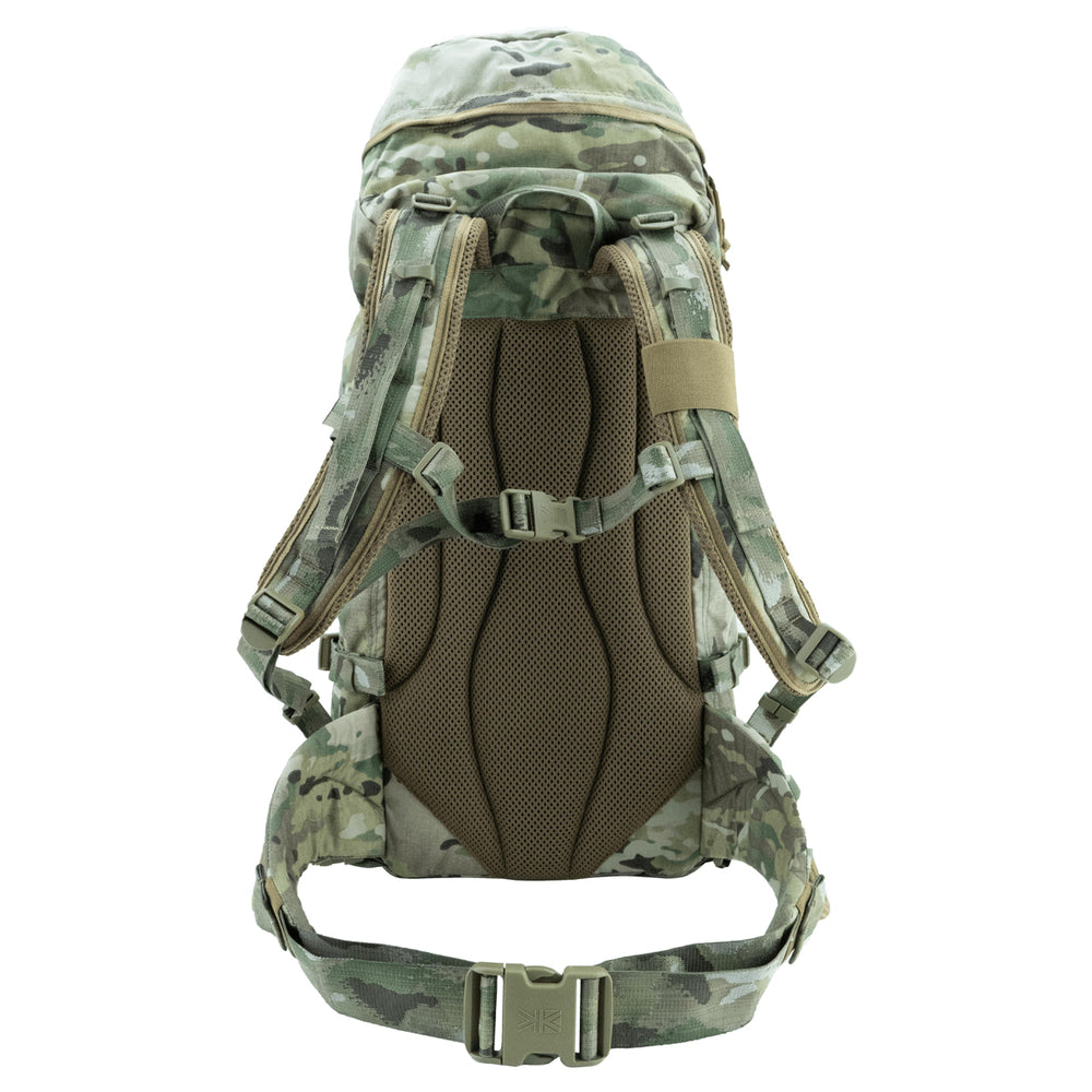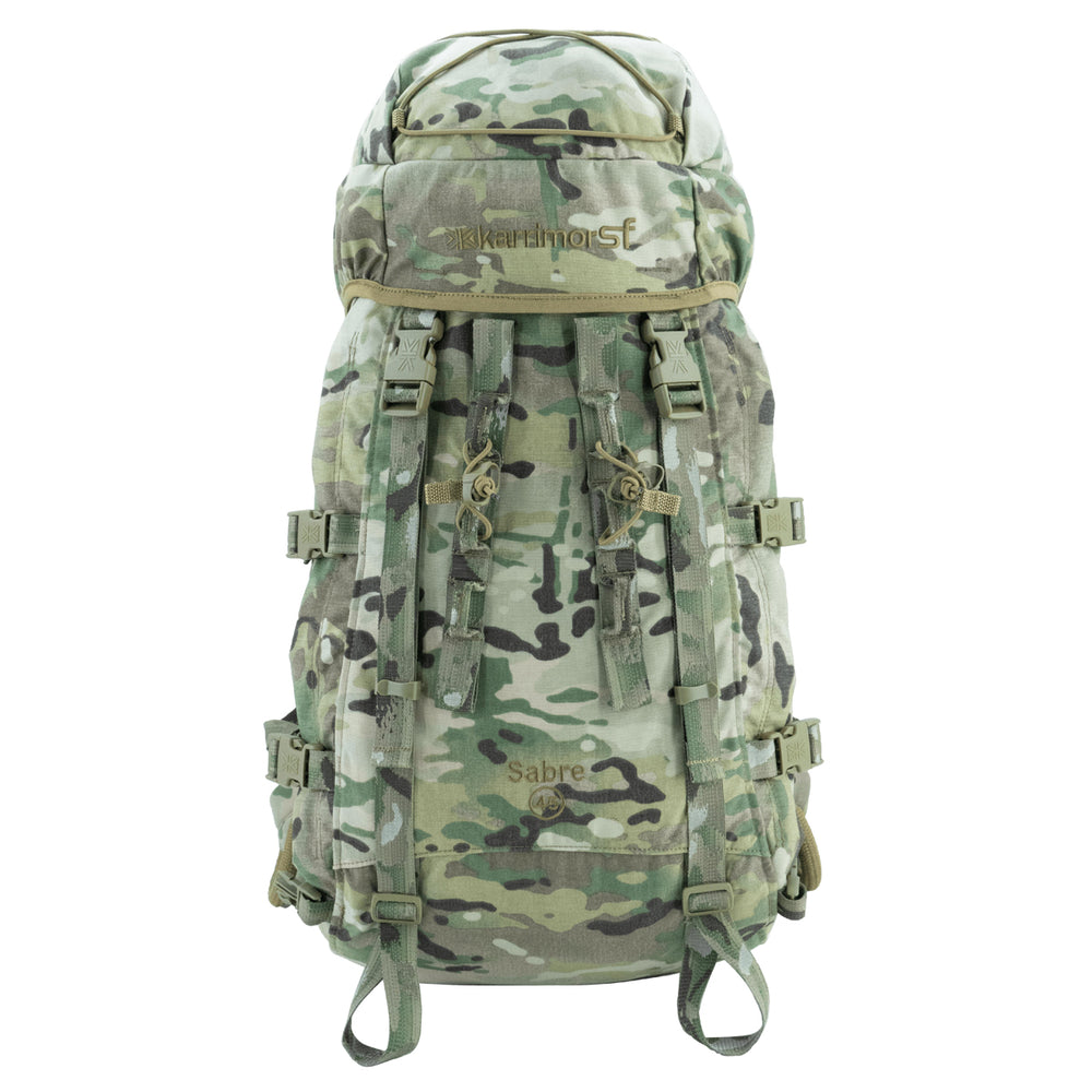 The main fabric used in the construction of the Sabre 45 is KS100e, a durable 1000 Denier Nylon material known for its exceptional tear and abrasion resistance. This fabric is equipped with a waterproof elastomeric polyurethane (PU) coating on the reverse side and finished with a durable water repellent (DWR) on the outer face. For the Multicam model, the backpack is constructed from 500D Infra-Red Reflective (IRR) fabric and features Jacquard woven, Infra-Red Reflective (IRR) treated webbing to complement the main fabric.