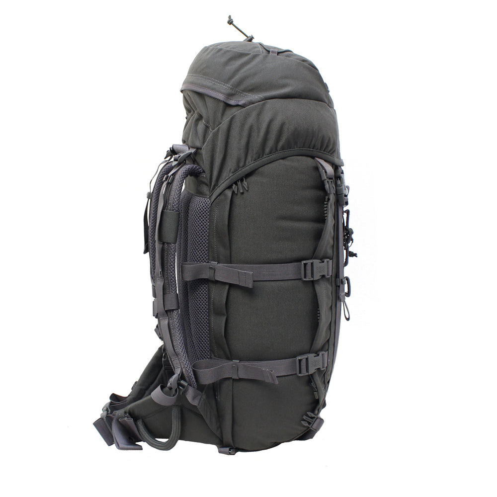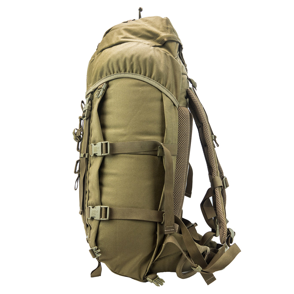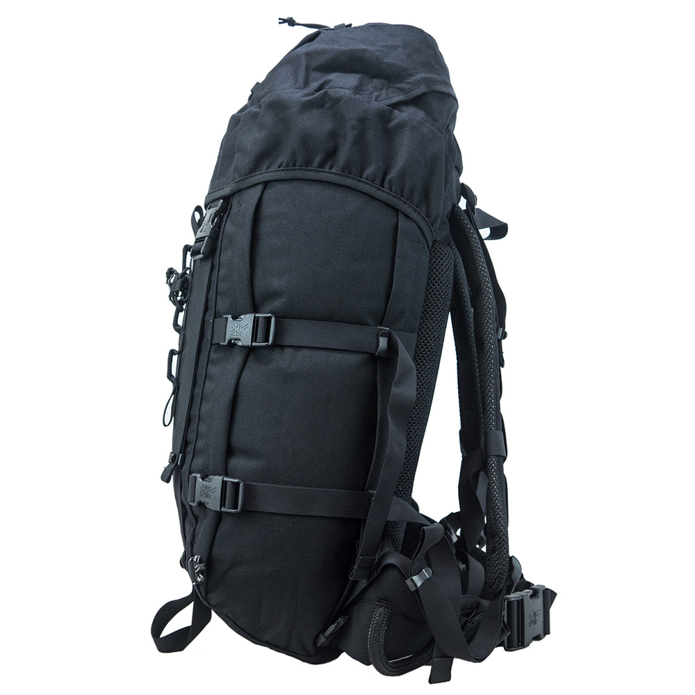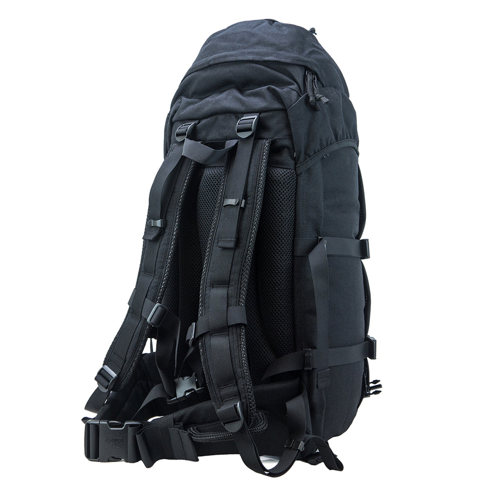 The main fabric used in the construction of the Sabre 45 is KS100e, a durable 1000 Denier Nylon material known for its exceptional tear and abrasion resistance. This fabric is equipped with a waterproof elastomeric polyurethane (PU) coating on the reverse side and finished with a durable water repellent (DWR) on the outer face. For the Multicam model, the backpack is constructed from 500D Infra-Red Reflective (IRR) fabric and features Jacquard woven, Infra-Red Reflective (IRR) treated webbing to complement the main fabric.