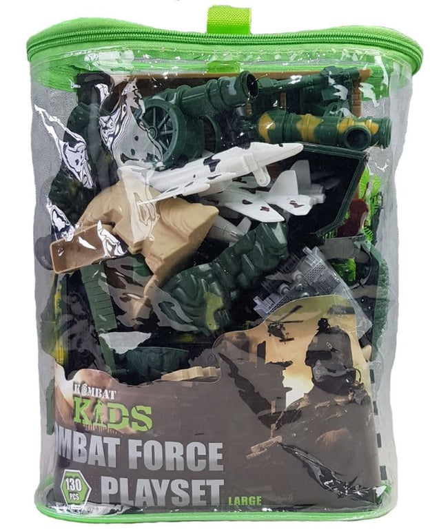 Introducing the Kombat UK Force Toy Soldier Set in a large size, featuring 130 pieces for hours of imaginative play. This kids' toy soldier playset includes an array of items such as toy soldiers, sandbags, tanks, jeeps, trees, barrels, and planes, providing a realistic battlefield experience.