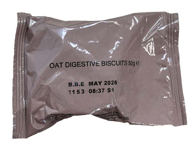 These are genuine British army ration pack oat digestive biscuits. MRE's are a great long lasting food idea for bulk storage of your food preps or simply as a good nutritious snack when out and about. These are a great as a standalone snack or as a desert with other main meal pouches. These are 5g pouches