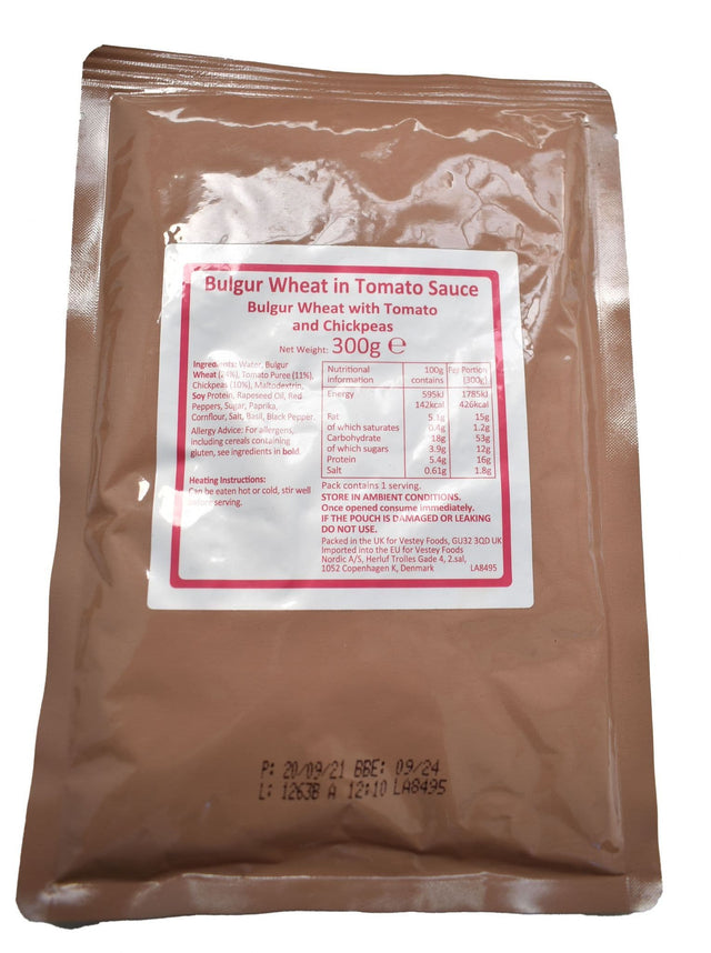The British Military Ration Main Meal Pouch - Bulgur Wheat In Tomato Sauce 300g are a must have when heading outdoors! With the ability to be eaten hot or cold, these main meals are a quick and convenient way of filling a hole at the end of a long day of adventures. Originally issued to the British military, these pouches are perfectly nutritionally balanced and are specifically designed for survival purposes. With a long shelf life, these rations are also perfect for long term storage.