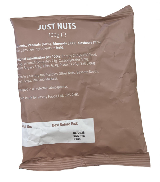 The British Military Ration Pack Accessory - Just Nuts 100g are high in energy and will provide you with that energy boost when you need it most! At just 100g a pouch, these nuts are the perfect snack to stash in your rucksack without weighing you down and will keep you full for the adventure ahead. Designed to last for 20 years, these are a great addition to your long term survival supplies.