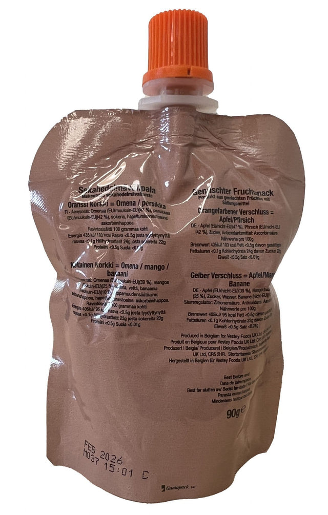 A really popular component of British Military ration packs, the British Military Ration Pack Accessory - Mixed Fruit Drink 90g are such a quick, easy and tasty source of energy. Containing either a blend of apple and peach or apple, mango and banana, each fruit drink contains almost 100kcal each. Great for children and adults alike, these fruit drinks will last up to 20 years which make them a great addition to your long term survival supplies.
