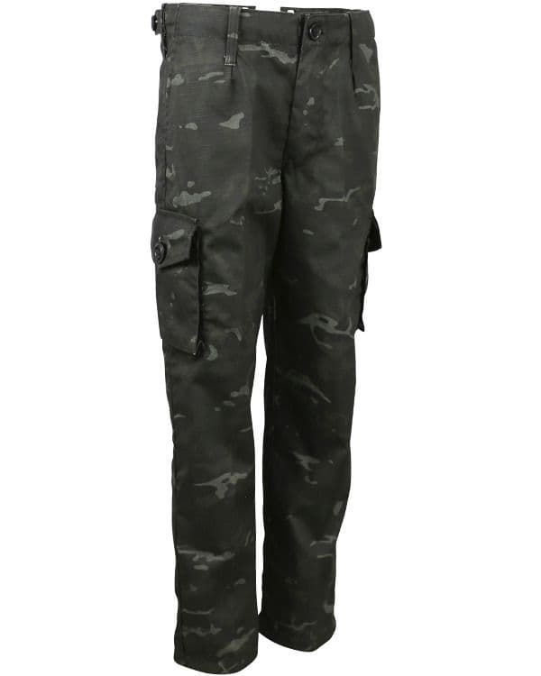 The Kombat UK BTP Black Trousers - Kids are made from tough and durable polycotton ripstop material which are designed to endure even the toughest of outdoor environments. They also include a zip fly and 6 pockets, more than enough to stash all of your survival gear or gadgets! The cool BTP Black camouflage pattern make these trousers perfect for camping, bushcraft, airsoft, paint balling and more. These trousers from Kombat UK are ideal for litter adventurers and are available from ages 3-13 years!