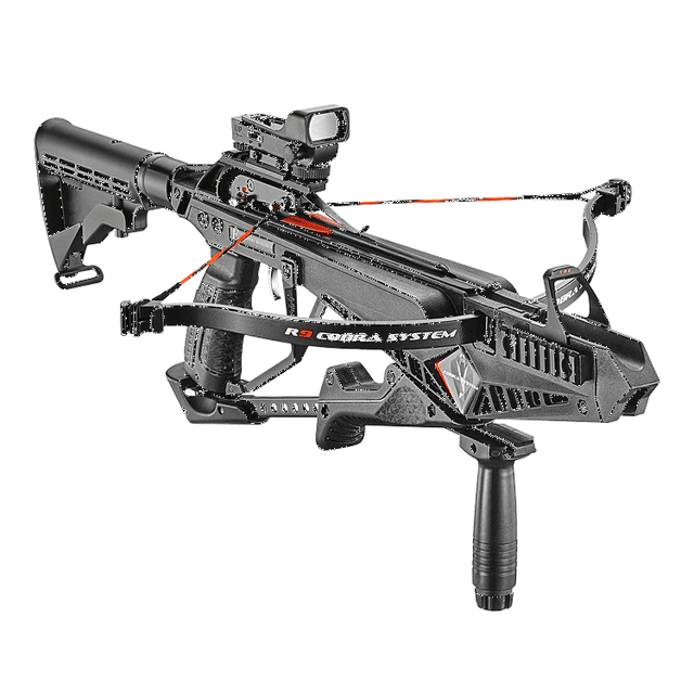 This crossbow will produce power of 240fps with carbon bolts, double the force of traditional pistol crossbows. The carbine style crossbow has an integrated lever making it extremely fast and easy to hand cock. The 90lb limbs of the Cobra are easily removed and reinstalled allowing the crossbows to be carried and stored. The Cobra R9 is fitted with a multitude of accessory rails that is perfect for sights, lasers or other attachments.